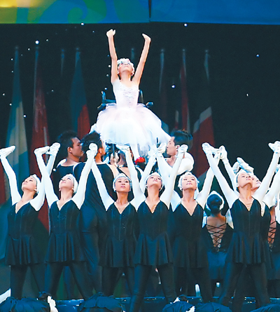 來自中國殘疾人藝術(shù)團的演員們環(huán)繞在李月身邊,用她們的雙手去代替李月跳動的足尖。這是她永不停止的芭蕾舞步。眾人手臂一波一波舞動,展現(xiàn)著芭蕾舞的優(yōu)美雅致。被“芭蕾王子”呂萌高高托舉起的這位四川女孩,在空中不停地旋轉(zhuǎn),飄逸的舞衣,陽光而自信的神情。