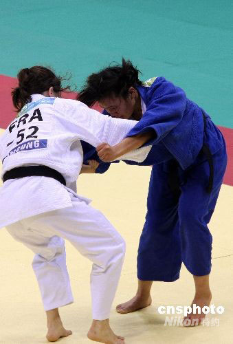 9月7日,在北京殘奧會盲人柔道女子52公斤級的決賽中,中國選手崔娜(藍(lán)衣)擊敗法國選手桑德里娜·奧里埃·馬蒂內(nèi),獲得金牌。中新社發(fā) 王韶驊 攝