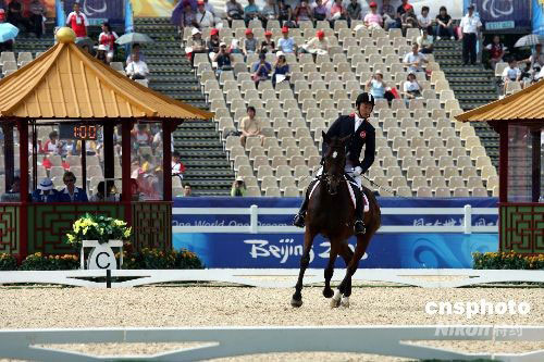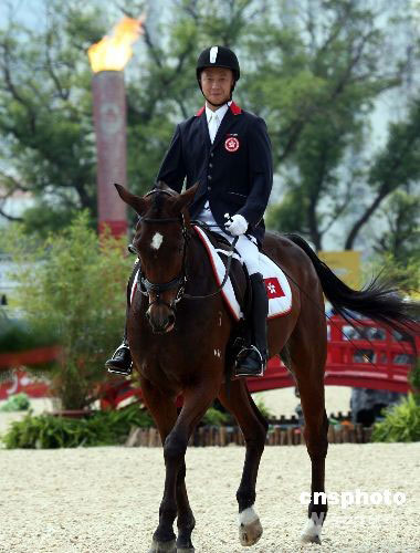 九月八日上午,殘奧會(huì)馬術(shù)賽在香港沙田賽場(chǎng)進(jìn)行盛裝舞步團(tuán)體賽,中國(guó)香港選手葉少康輕駕坐騎“履冰之注”出賽,獲得五十點(diǎn)七二七分。中新社發(fā) 洪少葵 攝