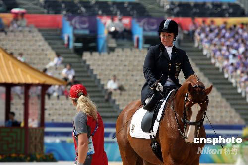 九月八日上午,德國選手安格莉卡·特拉貝特在香港舉行的殘奧會馬術(shù)盛裝舞步團體賽上表現(xiàn)出色。本屆殘奧會馬術(shù)項目只設(shè)有盛裝舞步賽,將產(chǎn)生十一枚金牌,其中包括十枚個人賽金牌及一枚團體賽金牌,獲獎馬匹將獲贈佩花及可裝飾馬房的馬匹銅牌。中新社發(fā) 洪少葵 攝