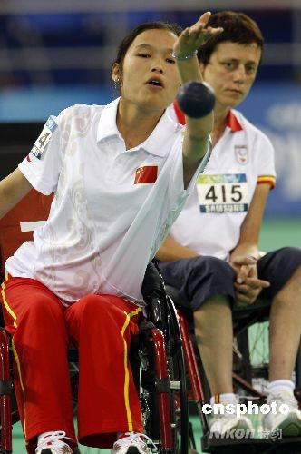 9月8日,北京殘奧會(huì)硬地滾球混合單打-BC4級(jí)小組循環(huán)賽中,中國選手戚翠芳以8比3的比分戰(zhàn)勝巴西選手桑托斯,順利晉級(jí)四分之一決賽。 中新社發(fā) 杜洋 攝