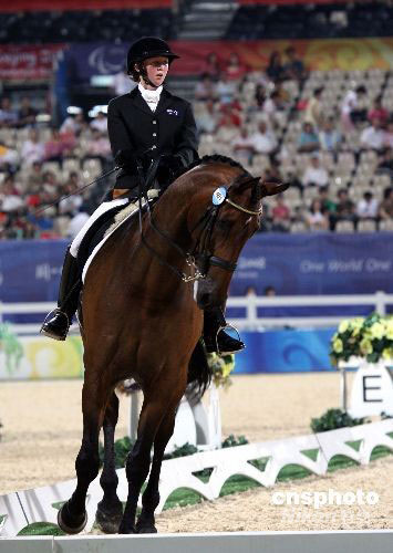 九月八日晚,在香港殘奧馬術(shù)“盛裝舞步團體賽”賽中,澳大利亞選手喬治婭·布魯斯策騎“薩魯特”展示實力,獲得六十八點二五八分。為期五天的北京殘奧委會馬術(shù)項目,有來自二十八個國家和地區(qū)的七十三名選手及七十一匹參賽馬匹將角逐十一枚金牌,參賽國家和地區(qū)數(shù)目、選手和馬匹數(shù)目都創(chuàng)歷史記錄。中新社發(fā) 洪少葵 攝