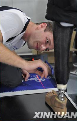圖為9月8日,維修人員通過激光校準(zhǔn)儀在為一名俄羅斯運動員的“左腳”進(jìn)行檢測。新華社記者 陳曉偉攝