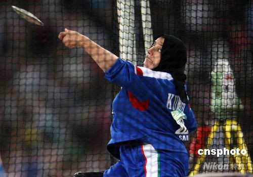 9月10日晚,北京殘奧會田徑各項比賽繼續(xù)在北京奧林匹克公園內(nèi)的國家體育場-鳥巢舉行,各國女子大力士在鐵餅比賽中竭盡全力向冠軍發(fā)起沖擊。圖為頭戴黑色頭巾的科威特選手瑪哈·謝拉揚奮力將鐵餅擲出。 中新社發(fā) 任晨鳴 攝