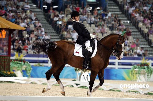 九月十日晚,來自加拿大的選手勞倫·巴威克在香港殘奧馬術(shù)個(gè)人自選動(dòng)作科目級(jí)別II的比賽中,獲得七十二點(diǎn)七七六分,暫時(shí)排名第一。中新社發(fā) 洪少葵 攝