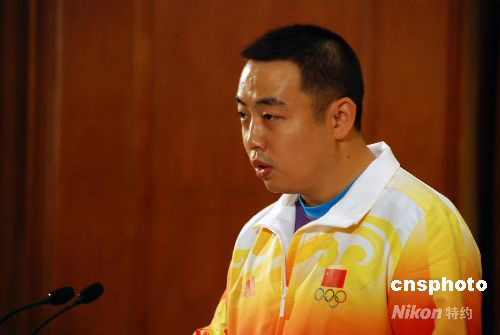 圖:乒乓球男隊主教練劉國梁在報告會上發(fā)言