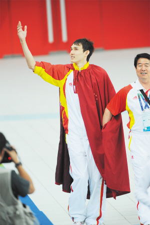 雖然最終收獲的還是“銀鑲玉”,但是楊博尊的心情已和8日晚有著天壤之別,臉上掛滿了笑容。“這雖然不是我的主項(xiàng),但是我發(fā)揮得很好,超越了自己,F(xiàn)在我終于知道,‘水立方’不僅有‘金鑲玉’,還有更多的是超越。無論是我,還是我的隊(duì)友,我們都很努力,都在不斷地超越自己!迸d奮的楊博尊披上了早就準(zhǔn)備好的“戰(zhàn)袍”,這本是他為自己奪冠時(shí)準(zhǔn)備的。