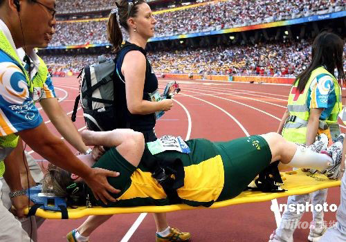 9月12日,北京殘奧會田徑比賽舉行在北京奧林匹克公園內(nèi)的國家體育場-鳥巢舉行,澳大利亞女子鉛球選手卡思·普勞德福特在上午進(jìn)行的女子鉛球-F35/36級別的比賽第五次投擲后當(dāng)場昏厥,被緊急送往醫(yī)院救治。 中新社發(fā) 任晨鳴 攝