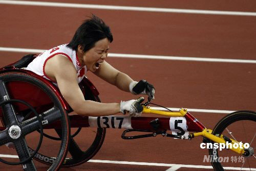 9月12日,北京殘奧會(huì)女子100米-T53決賽中,中國(guó)選手黃麗莎以16秒22的成績(jī)打破世界紀(jì)錄獲得冠軍。 中新社發(fā) 盛佳鵬 攝