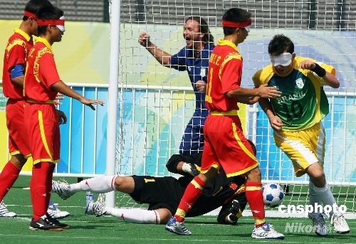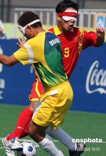 9月15日下午,北京殘奧會(huì)五人制(盲人)足球預(yù)賽最后一輪比賽在北京奧林匹克公園內(nèi)的橄欖球場舉行,此前均保持全勝紀(jì)錄的中國隊(duì)與巴西隊(duì)相遇,巴西隊(duì)10號(hào)里卡多·阿爾維斯率先攻破中國隊(duì)大門;中國隊(duì)9號(hào)隊(duì)長王周彬下半時(shí)破門得分。最終雙方以1比1戰(zhàn)平,攜手晉級(jí)決賽。中新社發(fā) 任晨鳴 攝
