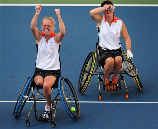 9月15日,北京殘奧會輪椅網(wǎng)球女雙總決賽中,荷蘭22歲的科麗·霍曼(左)和莎倫·瓦爾拉芬2-1戰(zhàn)勝同胞埃絲特·費(fèi)海爾和伊斯克·格里菲翁,取得本屆殘奧會輪椅網(wǎng)球女雙金牌。賽后這對組合喜極而泣。