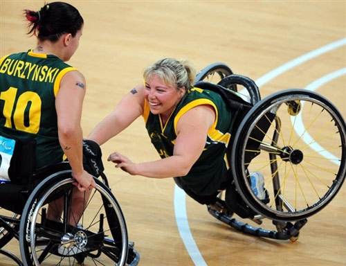 9月8日,殘奧會(huì)輪椅籃球賽,澳大利亞隊(duì)對(duì)巴西隊(duì)的比賽中,澳大利亞的凱莉·戈西跌倒后,另一名隊(duì)友克萊爾·布爾津斯基前來(lái)幫忙。