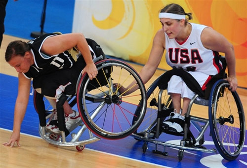 殘奧會(huì)輪椅籃球賽,德國(guó)隊(duì)對(duì)美國(guó)隊(duì)的比賽中,美國(guó)隊(duì)的球員克里斯蒂娜·里普幫助跌倒的德國(guó)隊(duì)隊(duì)員諾拉·施拉茨。