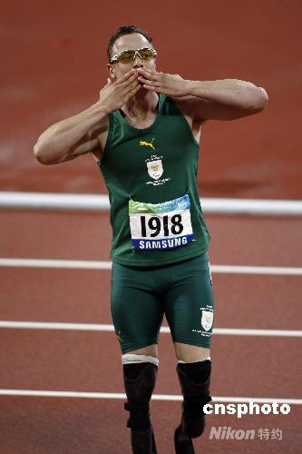 9月16日,北京殘奧會男子400米T44決賽,南非的“刀鋒戰(zhàn)士”皮斯特瑞斯以47秒49的成績打破世界紀(jì)錄,奪得個人在本屆殘奧會短跑項目上的第三塊金牌。 中新社發(fā) 杜洋 攝