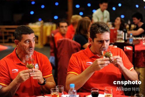 9月16日晚,兩名西班牙殘奧運(yùn)動(dòng)員在北京老舍茶館品茗。中新社發(fā) 廖攀 攝