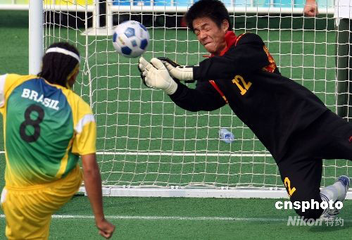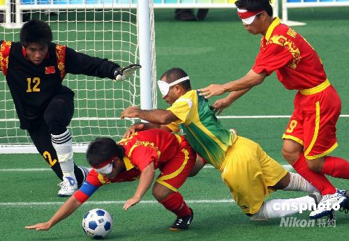 9月17日下午,北京殘奧會五人制足球決賽在北京奧林匹克公園內(nèi)舉行,雅典殘奧會冠軍巴西隊(duì)依靠強(qiáng)大的實(shí)力,最后以2比1擊敗中國隊(duì)蟬聯(lián)冠軍。中新社發(fā) 任晨鳴 攝