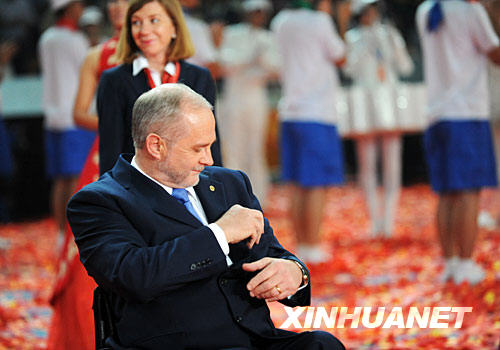 9月17日,北京2008年殘奧會(huì)閉幕式在國家體育場(chǎng)“鳥巢”舉行。圖為國際殘奧委會(huì)主席克雷文在致辭前拾起場(chǎng)內(nèi)的紅葉紙花放入衣袋。新華社記者 李尕 攝