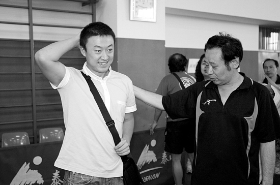 市體校還有一個9歲的“小馬琳”。這個“小馬琳”名叫夏嘉鳴,是馬琳舅舅的兒子。昨天下午,馬琳耐心地教起了“小馬琳”。在與表弟練習(xí)了幾下推擋后,張惠忠接過了球拍,而馬琳則站在一邊專心地觀察夏嘉鳴打球!皠e緊張,慢慢來!”夏嘉鳴有些緊張,馬琳在一邊輕聲提醒。“手腕再向前送一點!笨粗淼軒状问д`,馬琳走上前去手把手地教。如何評價表弟的水平?馬琳笑了:“現(xiàn)在評價他還早,怎么也要過幾年才能看出來,現(xiàn)在對他來說,最重要的是勤奮!