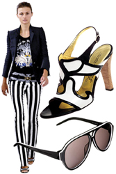 航海風貌的熱潮繼去年一直延續(xù)至今,條紋圖案依舊可以成為選擇的目標,只是本季的設(shè)計為航海主題略添了幾分女性柔美的元素。銀色絞繩式高跟涼鞋;金色船錨和紅珊瑚串成的項鏈;玫瑰紅與藍色條紋拼合而成的tubetop式的連衣裙裙擺都鑲著亮鉆。這一系列元素都為一向中性化的航海設(shè)計增添了女性主義色彩。牛仔布和斜紋布依舊熱門,Diesel的白色牛仔褲和襯衫、Trovata的綠色白邊T恤和寬松的闊口褲都是時尚達人們的寵兒。