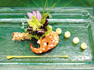 其實(shí)就是荷汁面拌遼參。這道菜的構(gòu)思比較特別,它是用新鮮荷汁來打面條,打出來的面條質(zhì)地細(xì)膩無瑕,滲透著荷葉獨(dú)有的清香、甘甜的氣息。蓮葉還有和血、清暑、去濕的功效。遼參味道爽脆、比較新鮮,也很適合夏天。