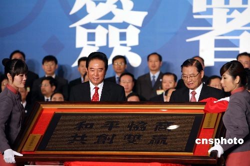 圖:江丙坤贈陳云林"和平協(xié)商 共創(chuàng)雙贏"匾額