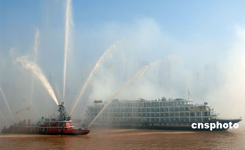 圖:重慶舉行內(nèi)河旅游客輪火災撲救演習