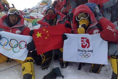 北京奧運圣火成功今天上午9時許登上珠峰,登山隊員們在峰頂進行了火炬接力,接力活動結(jié)束后,隊員們在世界之巔展示熊熊燃燒的祥云火炬以及中國國旗、奧運五環(huán)旗和北京奧運會會徽旗。