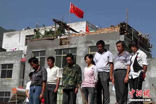 汶川泥石流災(zāi)害搶險(xiǎn)人員向舟曲遇難者默哀