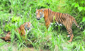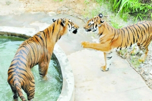 廣東省唯一的華南虎馴養(yǎng)繁殖基地——“粵北華南虎馴養(yǎng)繁殖研究中心”飼養(yǎng)的兩只國寶級(jí)成年華南虎“公主、王子”,自今年3月10日初婚洞房后,至今仍沒有懷孕跡象。昨天上午,在本報(bào)記者的見證下,研究中心決定實(shí)施第二階段的繁育試驗(yàn)——讓公主與王子雙雙再入洞房,然后零距離長時(shí)間生活培養(yǎng)感情增加懷孕幾率。