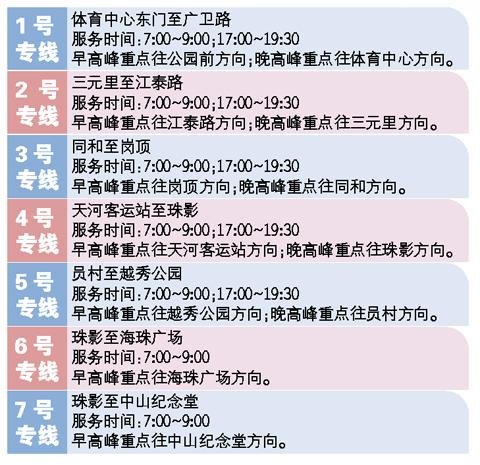 從今天起,(廣州)市民搭乘公交地鐵不再免費(fèi),相關(guān)交通補(bǔ)貼該如何發(fā)放,政府相關(guān)部門正在研究制定,以確保符合條件的每個(gè)家庭和個(gè)人都能享受到。記者昨天從廣州市交委獲悉,為進(jìn)一步方便市民出行,從今天起,交通部門將在上下班高峰期增開7條公交專線,分別與地鐵一號線、二號線、三號線、五號線、八號線等一些客流量集中的地鐵線網(wǎng)區(qū)段平行走向。