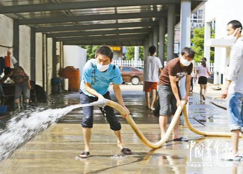 10月13日,在浙江省余姚市梨洲街道的一廠區(qū),從河南商丘來(lái)此打工的劉開(kāi)會(huì)(左)和工友們一起清洗并消毒被洪水浸泡過(guò)的廠區(qū)。受臺(tái)風(fēng)“菲特”的影響,余姚遭受歷史上罕見(jiàn)的特大洪水,城區(qū)和鄉(xiāng)鎮(zhèn)大面積受淹。目前,城區(qū)的積水已基本排完,生產(chǎn)生活正逐步恢復(fù)正常。在余姚的外來(lái)務(wù)工人員有50多萬(wàn),災(zāi)情發(fā)生后,當(dāng)?shù)匾龑?dǎo)鼓勵(lì)外來(lái)務(wù)工人員積極參與恢復(fù)生產(chǎn)的工作。 本報(bào)記者 陳劍攝