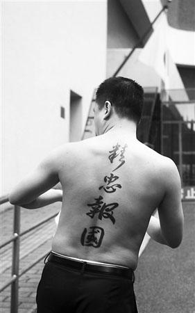 日前,劉強(qiáng)來到日本駐廣州總領(lǐng)館后脫下外套,亮出自己花4小時(shí)文出的“精忠報(bào)國”四字。