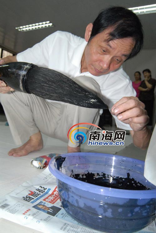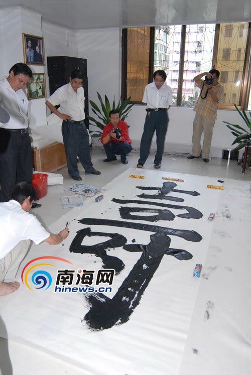 今天下午4時(shí)許,在?谑形乃嚶(lián)合會會長的辦公室里,余廣老先生先先是拿出他在家里練筆的大壽字向在場的記者們展示。展示完后,余老先生拿出自已帶來的筆和紙。在地上鋪上一張長達(dá)3.7米,寬為1.47米白紙,將白紙整平后,余老先生開始調(diào)墨,在文聯(lián)工作人員的幫助下,余先生揮起自己帶來的大毛筆,仔細(xì)整理毛筆后,余老先生在白紙開始揮舞,不用一會兒功夫,一個(gè)大形楷書壽字就寫成,在場的人給予了熱烈掌聲。(記者汪德芬)