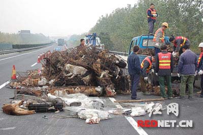 23日凌晨5時(shí)許,一臺(tái)中型貨車在京珠高速公路湖南段78公里側(cè)翻,貨車上運(yùn)載的兔子和狗在高速公路上到處亂竄,許多司機(jī)為避讓干脆將車停在超車道上。為保障交通安全,交警和施救人員只得在高速公路上四處抓捕、圈圍這些狗和兔子。