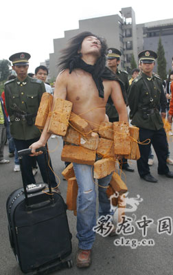 又是他!繼今年5月1日在南屏步行街以全身貼滿人民幣的形式進行了一場名為“金錢加權(quán)力等于一切嗎”的行為藝術(shù)后,云南藝術(shù)學院03級油畫班畢業(yè)生王軍昨天背負磚頭行走兩個多小時,用他覺得最棒的方式說一聲:“昆明,我走了。”