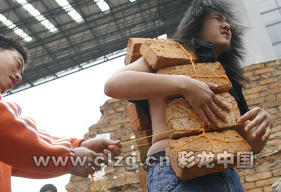 特殊的氣氛讓路過的學生和市民紛紛停住了腳步。10點30分,王軍在朋友的幫助下開始“裝備”。他脫去上衣,將一件黑T恤裹在脖子上,肩膀上掛上了26塊磚——每塊重約2斤,一時間,悠閑的表情變成了“臉紅脖子粗”。拖上一個裝了20塊磚的行李箱,王軍深呼了一口氣,走入云南藝術(shù)學院,準備穿過校園,經(jīng)西站沿西昌路、昆紡,抵達目的地昆明火車站。