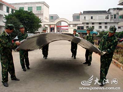 因天氣原因,直至30日下午,飄落于全南縣深山的運載“嫦娥一號”衛(wèi)星的長征三號甲火箭整流罩殘骸,在該縣人武部人員的護送下運往有關(guān)部門。記者獲悉后,獨家對此進行了采訪。