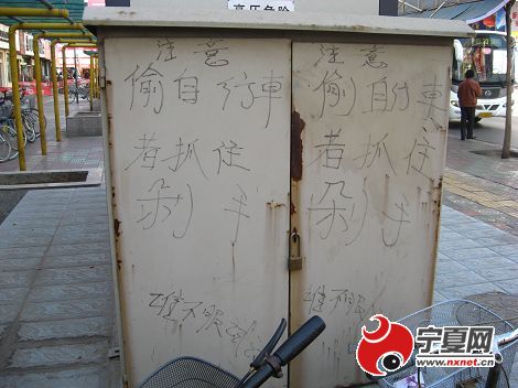 10月30日,記者在銀川市興慶區(qū)新華東街一電表箱上看到,有人用毛筆寫著“偷自行車者抓住剁手,誰不服試試”。