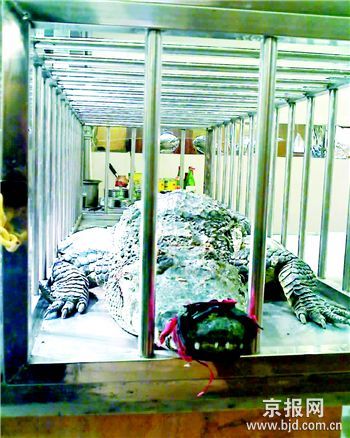昨晚7時(shí),記者來到位于魏公村的美洲島國際美食中心,在餐臺盡頭的中餐區(qū),一只長約160厘米、寬80厘米的鐵籠子隱藏在食物中間,一只身長約1.7米的鱷魚一動(dòng)不動(dòng)地趴在里面,顯得毫無生氣。鱷魚的尾巴蜷縮起來,眼睛緊閉,大嘴被一圈圈紅布綁得緊緊的。鱷魚兩旁趴著兩只大草龜,正努力地想往鱷魚背上爬。