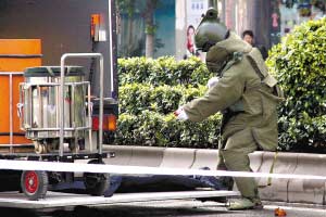事件發(fā)生后,身穿防爆衣的警察從綠化草叢里,拖出一個(gè)紅色包裝、粽子般大小的可疑物品,并將該物送進(jìn)一輛防爆車內(nèi)。2小時(shí)后,現(xiàn)場(chǎng)才解除了封鎖。