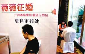 當(dāng)天的征婚,薇薇可做了充分準(zhǔn)備,對前來現(xiàn)場的每一個應(yīng)征者,她都讓他們填寫一份應(yīng)征資料表,上面除了正常的姓名、出生日期、身高、體重等數(shù)據(jù)外,有關(guān)應(yīng)征者的月均收入、住房狀況、從事行業(yè)、工作職務(wù)等更為具體的資料也要填寫。前來“面試的”,不乏博士生、碩士生和在讀大學(xué)生。這一點(diǎn),也尤其讓薇薇滿意,應(yīng)征的張先生,就懷抱大堆證件,包括四、六級英語證書等,向薇薇推介自己。