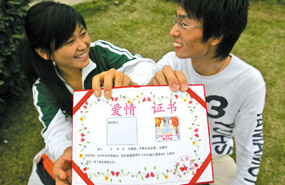 小郭首先在學(xué)校里推出了“愛(ài)情證書”,受到同學(xué)們的青睞,然后他又接著在校園網(wǎng)“貼吧”推廣。目前已有不少大學(xué)生情侶訂購(gòu)。
