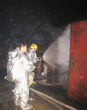此時(shí),遠(yuǎn)處天空不時(shí)騰起陣陣黑煙。隨著現(xiàn)場(chǎng)的臨近,記者對(duì)那位市民的告誡體會(huì)越深,空氣中的臭味愈發(fā)濃烈!熬褪悄莻(gè)廢棄物處理站里失火了,但你不能進(jìn)去,我們?cè)诶锩鏈缁鸬南绬T都戴著空氣呼吸器的!币晃幌绬T攔住了記者。就見(jiàn)處理站里不時(shí)躥出火苗,但在10多名消防員的奮力撲救下,漸漸勢(shì)弱。由于此處沒(méi)有消防栓,也沒(méi)有足夠的水源,數(shù)輛消防車用完水后,趕緊又離開(kāi)現(xiàn)場(chǎng)補(bǔ)充水。凌晨3點(diǎn)半,火勢(shì)終于被控制住,記者捂住鼻子試圖進(jìn)入站里查看情況,但剛邁入大門,刺激性氣體讓人直流眼淚,呼吸也更加困難。