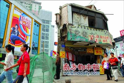 但就在商廈的門口和旁邊,散立著3棟孤零零的破舊房子,它們的外墻一片狼藉,很明顯,曾經(jīng)連接它們的其他房子都已經(jīng)拆掉了,變成了廣場的一部分,而它們卻繼續(xù)堅定地站在繁華的商業(yè)大廈面前?瓷先ザ嗌儆行┎粎f(xié)調。