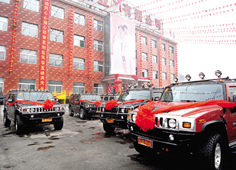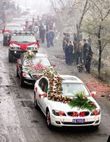 上午十點左右,迎親車隊出發(fā);檐囓囮犜诼飞吓牌鹆碎L龍,其中有12輛悍馬,龍鳳彩車走在最前面。據(jù)一位司機(jī)講,每輛彩車的裝修費用都高達(dá)6萬元。彩車因為經(jīng)過外部裝修視野不好,有專門的工作人員手持彩旗引導(dǎo)。