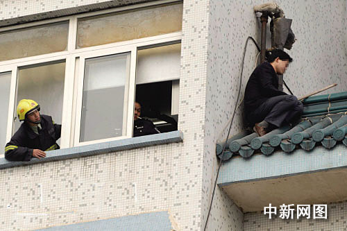 欲跳樓的男子手持一根一米長的帶釘木棍,半蹲半坐地倚在四樓樓頂?shù)墓战翘,他不斷揮舞著木棍防止他人靠近。在二樓的平臺上,派出所民警嚴(yán)陣以待,隨時準(zhǔn)備處置突發(fā)事件。四樓樓頂,艱難的談判正在進(jìn)行,衛(wèi)生部門的一位負(fù)責(zé)人與男子不停地交流著,此時男子的情緒相對穩(wěn)定,但只要看到民警靠近,男子就會立刻警覺,并將身子向樓頂邊緣靠去。