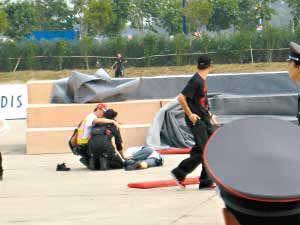 據(jù)目擊者小陳表示,他當(dāng)時(shí)正在觀看專業(yè)車手試駕表演,突然聽(tīng)見(jiàn)人群一陣騷動(dòng),扭頭一看,正好看到在非專業(yè)車手試駕區(qū)的一輛銀色越野車沖向看臺(tái)。當(dāng)時(shí),看臺(tái)上坐著一男一女兩人,身穿白衣上衣灰色褲子的青年男子閃避不及,被車撞飛了出去,“飛到20米開(kāi)外”。另一名目擊者表示,當(dāng)時(shí)試駕車上坐著一名白衣男子,在車輛失控前,他正準(zhǔn)備急剎右轉(zhuǎn),由于車速太快剎車不及,車子失控沖向了看臺(tái)。
