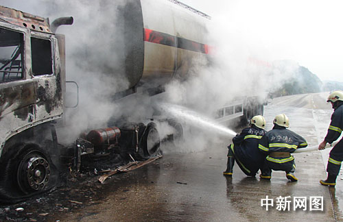 據(jù)消防官員稱,距現(xiàn)場1公里處,天空升起滾滾黑煙,現(xiàn)場油罐車火勢已經(jīng)在車頭和罐體整體燃燒起來。參戰(zhàn)官兵立即運用消防車車載水炮,冷卻油罐車罐體。10分鐘后,消防官兵在高速公路上鋪設(shè)兩條水帶干線,利用2支水槍前后夾擊進攻油罐車車頭和罐體火勢, 20分鐘后,油車大火被成功撲滅。