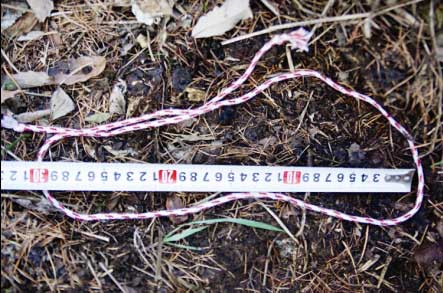 現(xiàn)場人員決定再從河邊著手,查找可疑痕跡。調(diào)查人員發(fā)現(xiàn),在腳印左邊的灌木叢上,一根距地面1.2米高的樹枝擋住去路,其上3根小枝似乎被不明物體通過時絆動,因擠壓而折斷。地上有明顯不規(guī)則的連續(xù)腳印,步距1米多。在腳印繞過一塊大石頭的地方,他們發(fā)現(xiàn)落葉腐殖土上的一大一小、同向、前后相鄰的兩個腳印(非鞋印),且能夠分辨出均為左腳。由于時間有限,調(diào)查人員決定放棄用帶來的石膏灌制腳印模型,待后續(xù)處理。