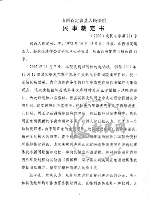 據(jù)媒體報(bào)道,郝勁松于11月7日正式向山西省定襄縣人民法院起訴“華南虎”拍攝者周正龍,按照民事訴訟法相關(guān)規(guī)定,在法定期限內(nèi),郝勁松沒有收到任何通知。11月28日,新民網(wǎng)連線郝勁松,他稱11月27日終于見到了定襄縣人民法院的民事裁定書,法院對郝勁松的起訴不予受理。郝勁松向新民網(wǎng)表示,他將在法定期限內(nèi)向山西省忻州市中級人民法院提出上訴。